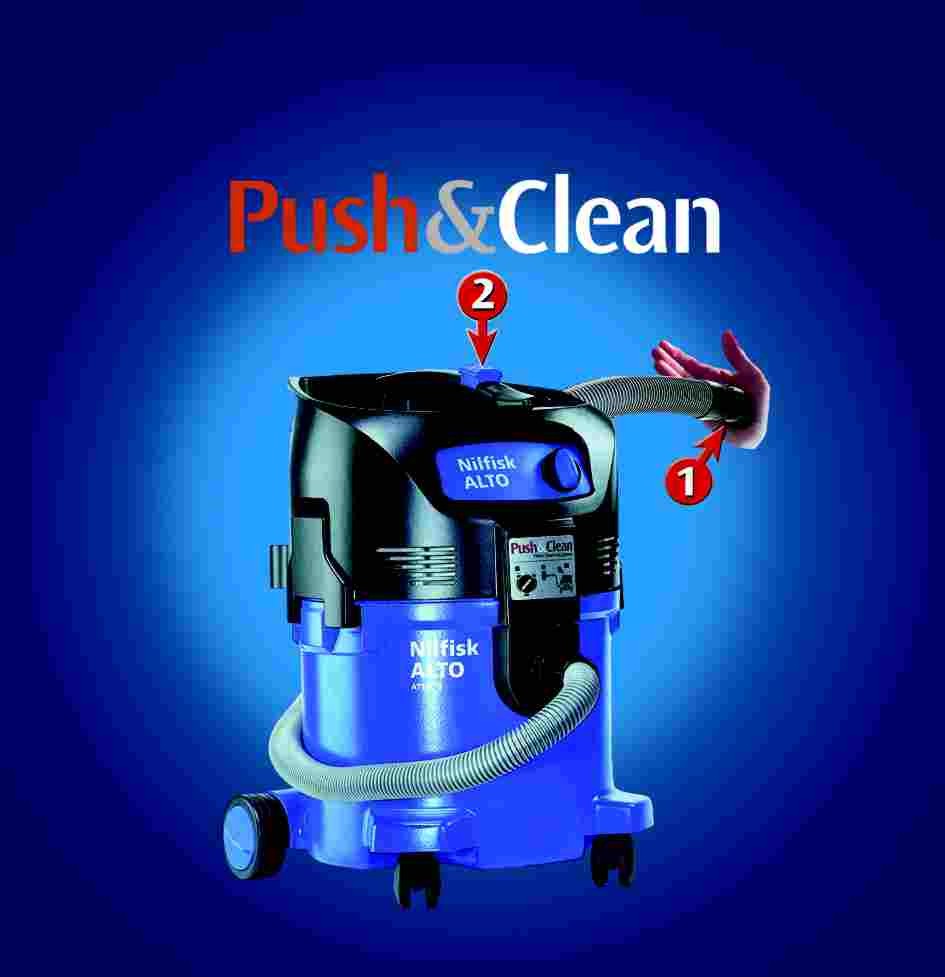 Bei laufenden Motor den Schlauch zu halten und den blauen Push&Clean Knopf mehrere male drücken. Die Abluft wird hierbei von innen nach aussen durch den Filter gedrückt und Feinstaub aus dem Filtermaterial in den Schmutzbehälter geblasen.