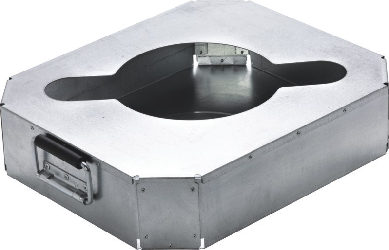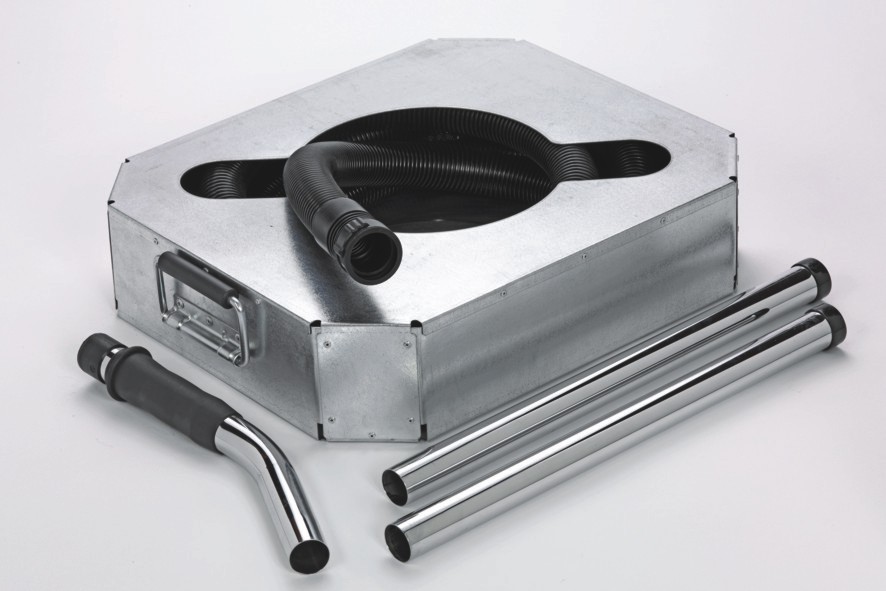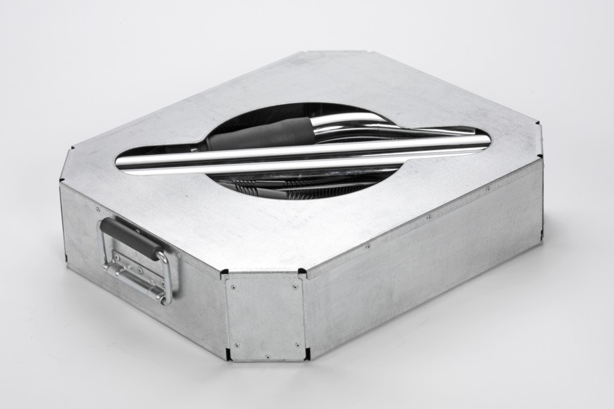 Stahlbox mit klappbarem Handgriff für eine sichere und einfache Aufbewahrung des Saugschlauches und Handrohre und Düsen.