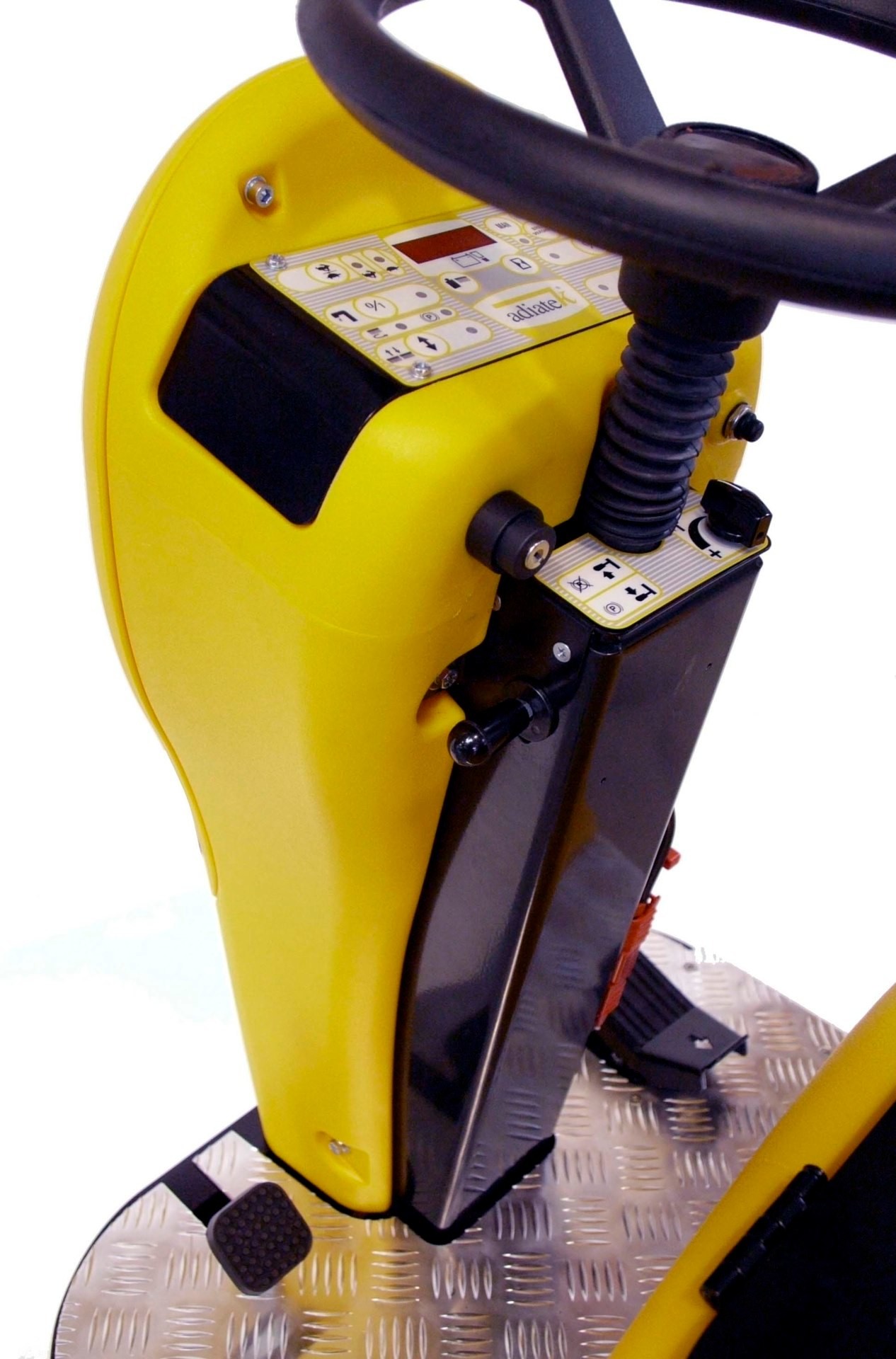 Aufsitzmaschine mit einer Arbeitsbreite von 70 cm. Die Walzenbürsten reinigen und führen das Schmutzwasser zum Grobschmutzbehälter, hier werden gröbere Verschmutzungen (Späne, Holzspriesel zurückgehalten, der nachfolgende Saugfuß nimmt das Schmutzwasser auf, somit entfällt der vorherige Kehrvorgang.