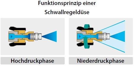 Druckregulierbarer Düsenkörper. Durch drehen des Schutzkörpers wird eine weitere Düse geöffnet - der Druck sinkt bei voller Wasserleistung. Stufenlose Druckregulierung.