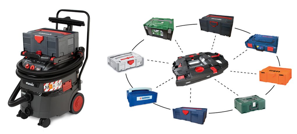 Eine für Alle – die Adapterplatte UniFix, die universell auf alle starmix-Baureihen iPulse, ISP und ISC passt. Einfachste Montage ohne Werkzeug, bei gleichzeitig zuverlässiger und stabiler Fixierung verschiedener Werkzeugboxen. Der Adapter ist kompatibel mit allen gängigen Box-Systemen, wie Systainer T-Loc, - Midi und den Systainer Classic sowie Bosch L-BOXX (Sortimo). Bei montierter Adapterplatte sind alle Bedienelemente und Steckplätze für Zubehör, wie Saugrohre und Düsen, zugänglich und nutzbar. Zusätzlich bietet die Platte eine komfortable Aufbewahrung der Netzleitung und des Saugschlauchs durch integrierten klappbaren Kabelhaken und zwei Schlauchhaken.